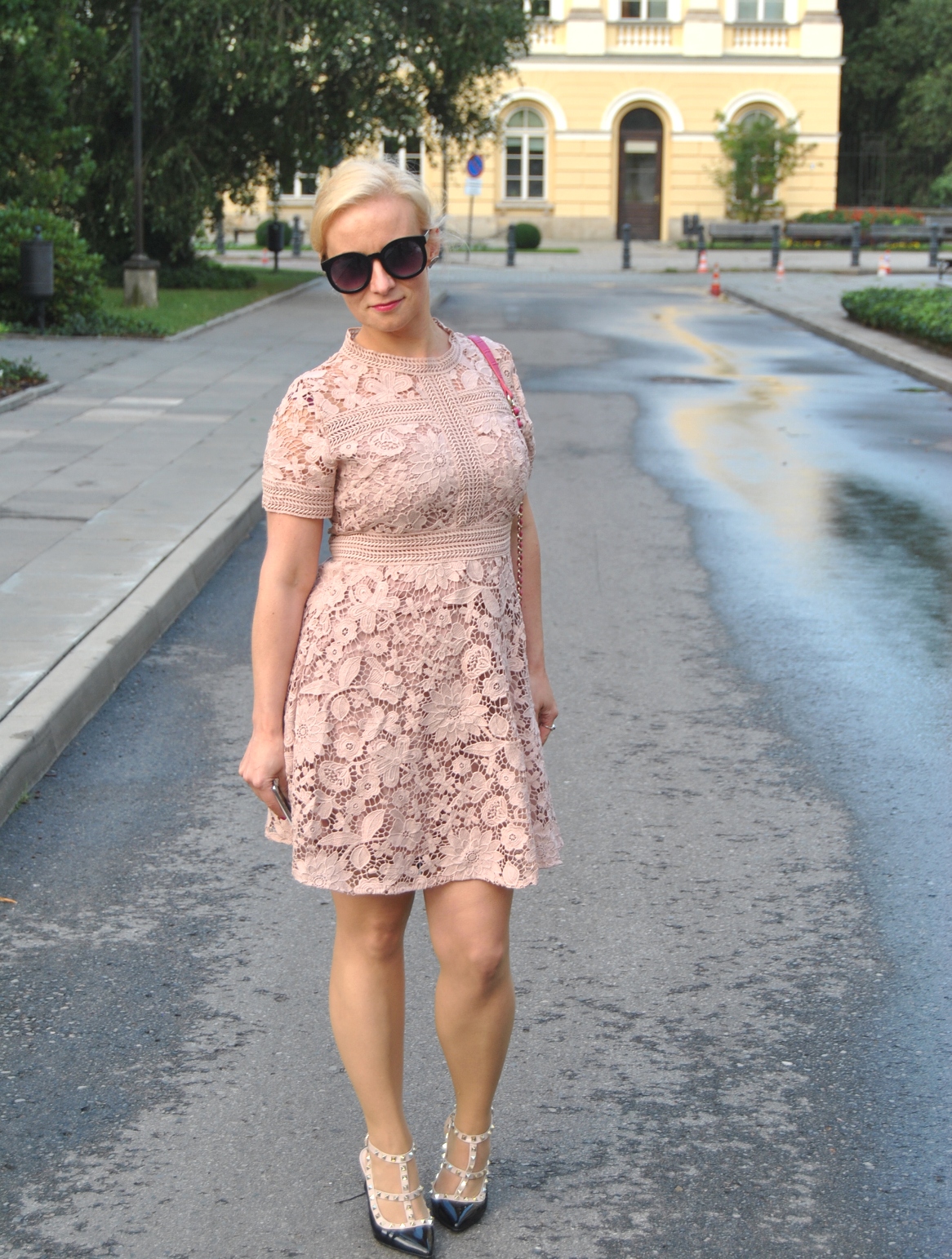 Fantastyczna koronkowa sukienka w kolorze pudrowego różu, zadziorne szpilki, mocna czarna ramoneska i dla słodyczy mała urocza torebka w kolorze fuksji.